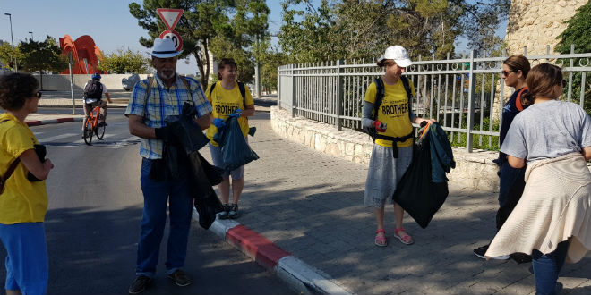 Los voluntarios de Bnei Efraim recogen la basura en el vecindario Kiryat HaYovel de Jerusalén, cerca del monte. Herzl. (Crédito: Gil Lewinsky)