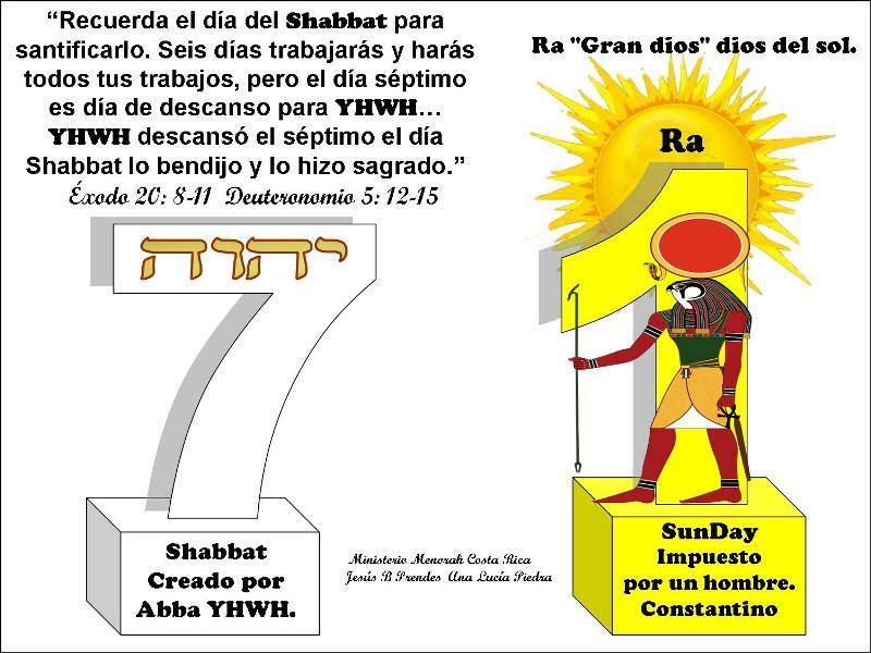 | Shabath – El séptimo día Sábado. Éxodo 31:13,16, Ezequiel 20:12, Levítico 23:3 | Domingo – SunDay (día del sol) celebrado desde tiempos antiguos en honor al dios sol. |