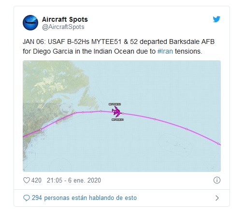 El número 52 apareció una vez más en el conflicto Irán-Estados Unidos. CNN informaron que seis bombarderos B-52 estaban en ruta desde la Base de la Fuerza Aérea Barksdale en Louisiana hasta Diego García, una base aérea de la isla en el Océano Índico ubicada a 2,300 millas al sur del extremo sur de Irán.