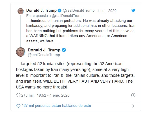 El presidente Trump se mantuvo firme contra Irán, amenazando con responder a las hostilidades en especie. Trump le dio un número específico a su amenaza; Se destruirían 52 sitios iraníes, lo que significaría el número de diplomáticos y ciudadanos estadounidenses que fueron rehenes durante 444 días desde el 4 de noviembre de 1979 hasta el 20 de enero de 1981, en la Embajada de los Estados Unidos en Teherán a raíz de la Revolución iraní.