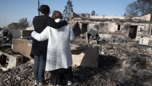 Los colonos israelíes se afligen por sus casas quemadas en el asentamiento Halamish el 27 de noviembre de 2016. AFP / MENAHEM KAHANA) Tenga en cuenta que no es tierra fuertemente forestada. Los vientos eran extremadamente poderosos.